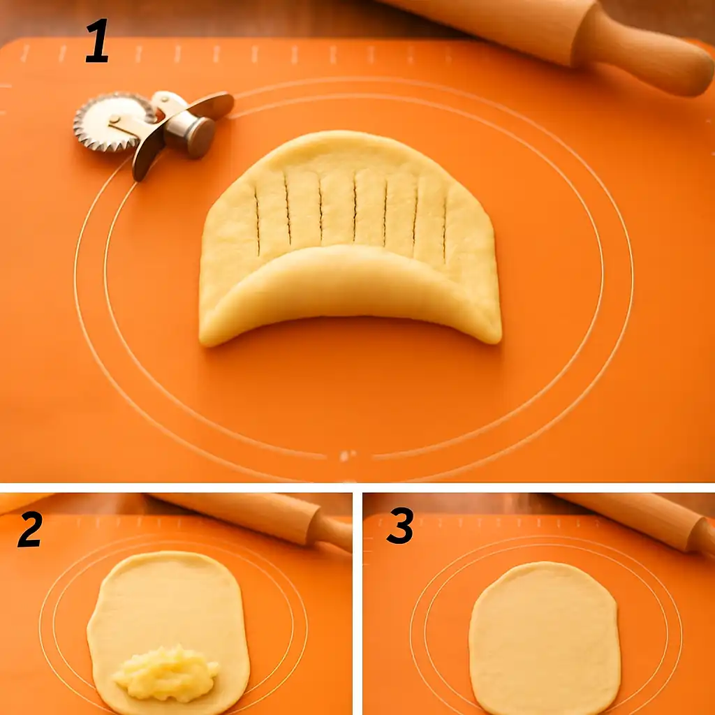 Готове тісто обімніть і поділіть на 10 частин по ~85 г. Сформуйте кульки, накрийте плівкою на 10 хвилин. Потім кожну розкачайте в овал, викладіть ложку заварного крему, загорніть край із кремом і добре защипніть.